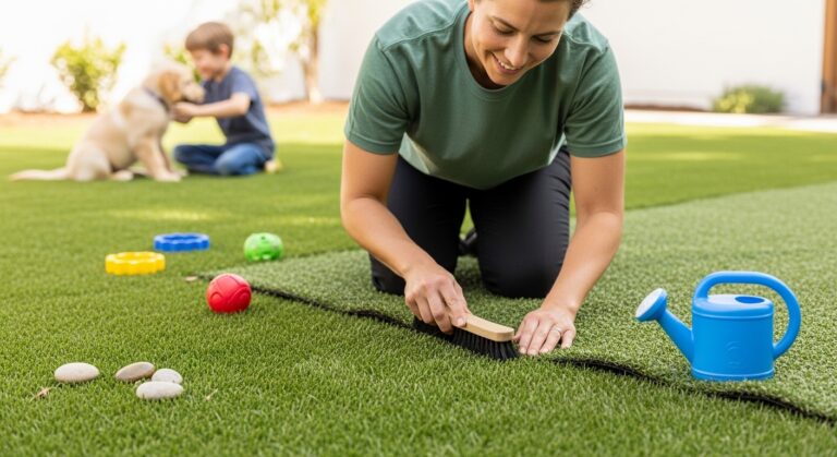 Turf requires minimal maintenance—occasional rinsing and brushing keep it fresh.